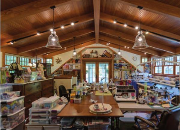 Just to the right of that front door is the new garage, and above it, Coffin's studio—an open, welcoming space bursting with creative spirit. Cross over a covered bridge walkway, above landscaped gardens and stone walls, and into the studio proper. Fabric and materials of every color and pattern line shelves, and a central table and desk serve as a hub for this skilled quiltmaker. To date, Coffin and a handful of like-minded craftspeople have made and donated more than 500 quilts to Turning Points Network in Claremont.