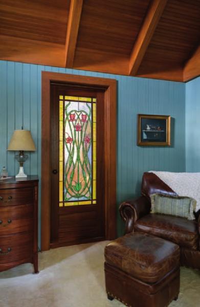 “We had an absolute blast going to salvage places in Maine, New Hampshire, Vermont, just looking for old pieces we could reuse,” Stocker says. “We reused a lot of old furniture and doors. Two of the stained-glass doors in the bedroom came from Staten Island, New York.”