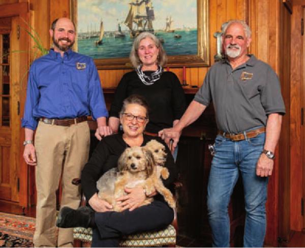The porch, with its stunning views of the lake and the boathouse below, is one of homeowner Deborah Coffin’s favorite parts of the house. Below: From left to right are Josh Stocker, Annie Ballin and Brent Stocker, with Deb Coffin (plus Molly and Mable) in front.