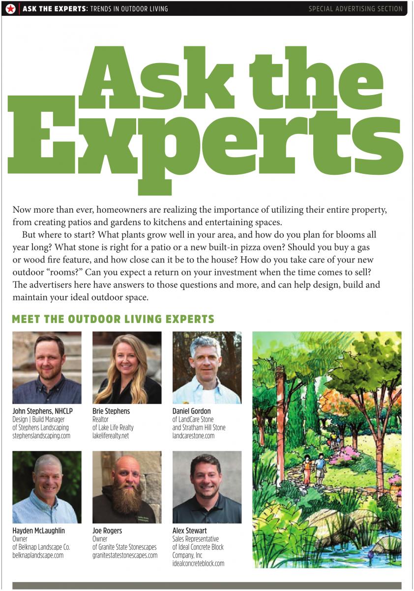 Now more than ever, homeowners are realizing the importance of utilizing their entire property, from creating patios and gardens to kitchens and entertaining spaces. But where to start? What plants grow well in your area, and how do you plan for blooms all year long? What stone is right for a patio or a new built-in pizza oven? Should you buy a gas or wood fire feature, and how close can it be to the house? How do you take care of your new outdoor “rooms?” Can you expect a return on your investment when the time comes to sell? The advertisers here have answers to those questions and more, and can help design, build and maintain your ideal outdoor space. MEET THE OUTDOOR LIVING EXPERTS John Stephens, NHCLP Design | Build Manager of Stephens Landscaping stephenslandscaping.com Brie Stephens Realtor of Lake Life Realty lakeliferealty.net Daniel Gordon of LandCare Stone and Stratham Hill Stone landcarestone.com Hayden McLaughlin Owner of Belknap Landscape Co. belknaplandscape.com Joe Rogers Owner of Granite State Stonescapes granitestatestonescapes.com Alex Stewart Sales Representative of Ideal Concrete Block Company, Inc idealconcreteblock.com