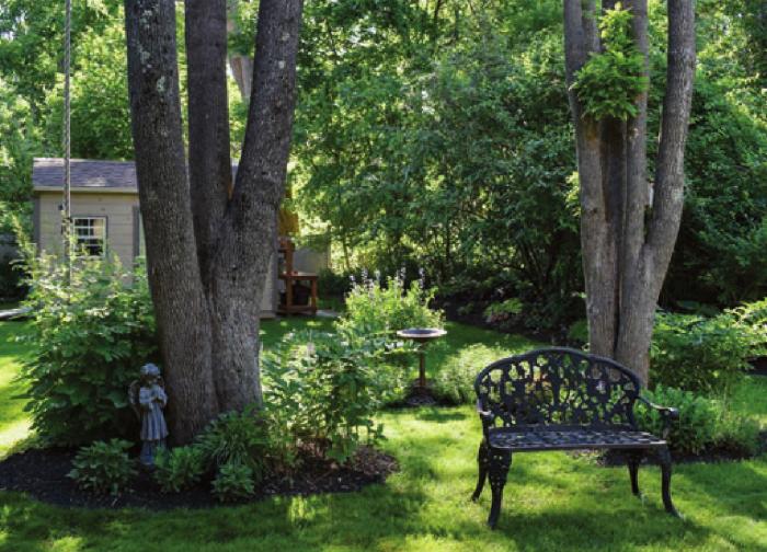 Other favorites that do well in her growing conditions are hostas, astilbe, heuchera, coneflowers, rudbeckia, bee balm and Shasta daisies. “I love my baptisia,” Slavin says. “It is in the island bed, and when the sun gets behind it and shines through, it is beautiful!” Several clematis vines and a climbing hydrangea add height to the garden. Slavin has a 30-year-old goatsbeard plant (Aruncus) that is a magnet for bees. “I have started putting down a lot of groundcovers too,” she says, “creeping Jenny, different colors of ajuga, some sedums and lily-turf.”