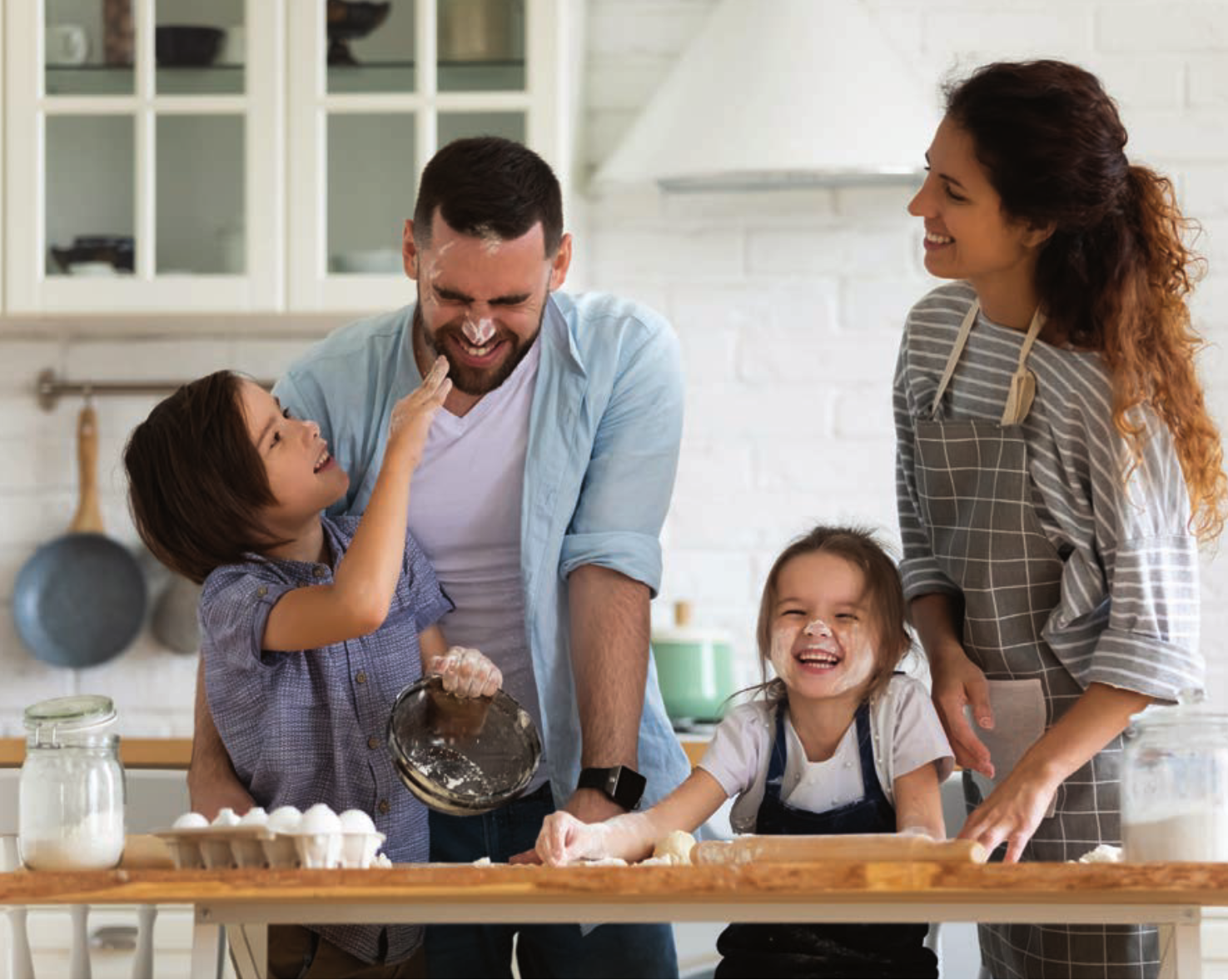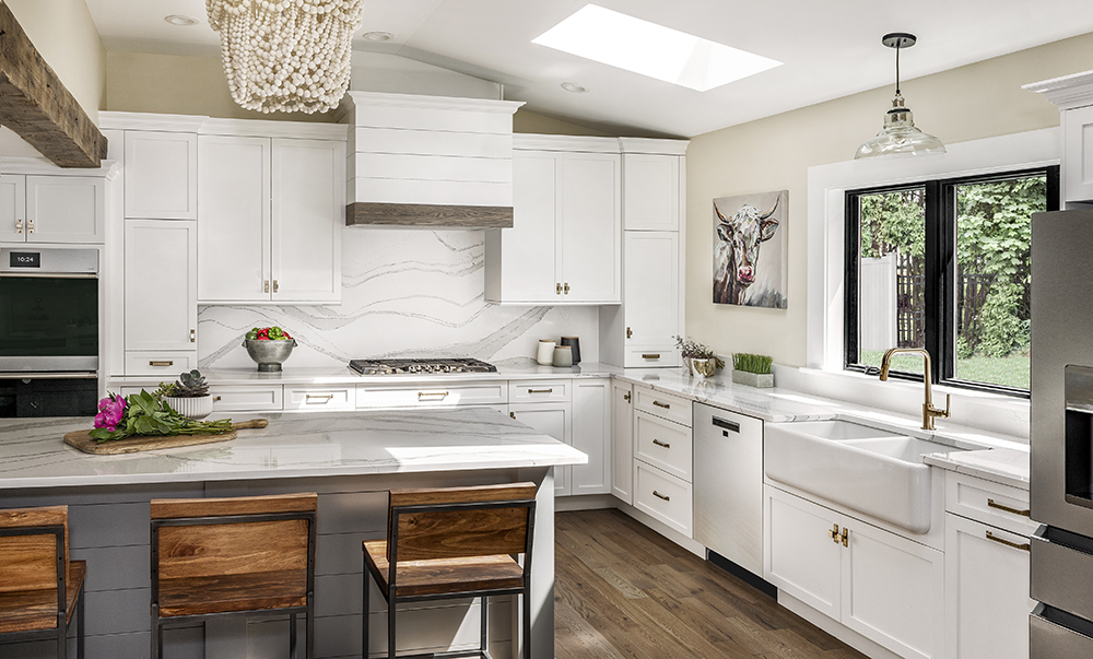Not only is the design comfortable, clean and bright, it’s practical. “It was crucial for the kitchen to not only look great but function well,” Dillman says. “The custom hood was designed and installed with the husband’s height in mind, and we added a few low storage drawers so the kids could reach their snacks and cups. The large island seats a large family, and has become the main place for their family to eat and play. Even the quartz countertops are durable and easy to keep clean. The whole space is fun but functional.”