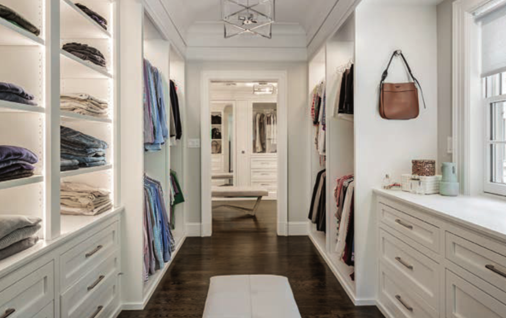 “Our goal was to extend their master closet and bath by taking over the space of a fourth bedroom and combining them together.” The color palette involved simple whites and grays to keep the rooms airy, modern and peaceful, with a feel of simplified traditional and classical styles to reflect the history of the home.