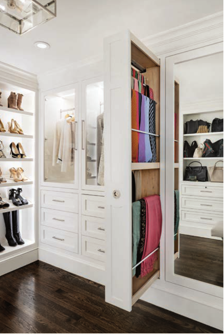 The new closet includes oak flooring that was stained dark to tie into the flooring throughout the rest of the home. The new dressing room showcases a large wall to display shoes and handbags, and has a variety of storage options and accessory pullouts for scarves, jewelry and garments.