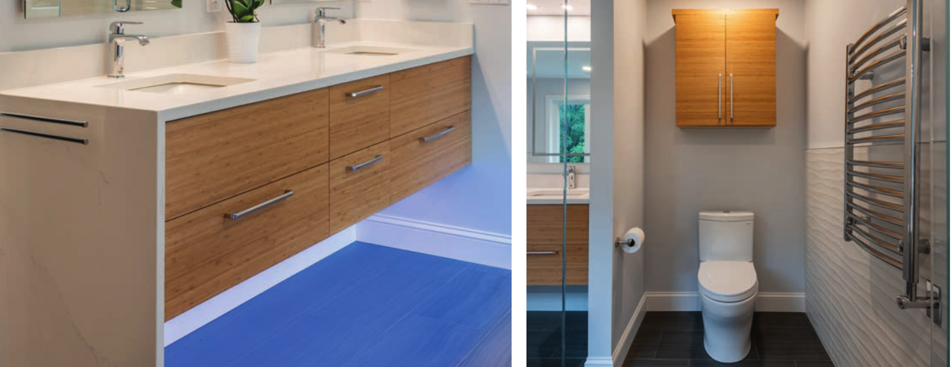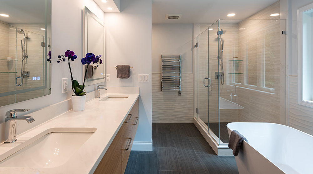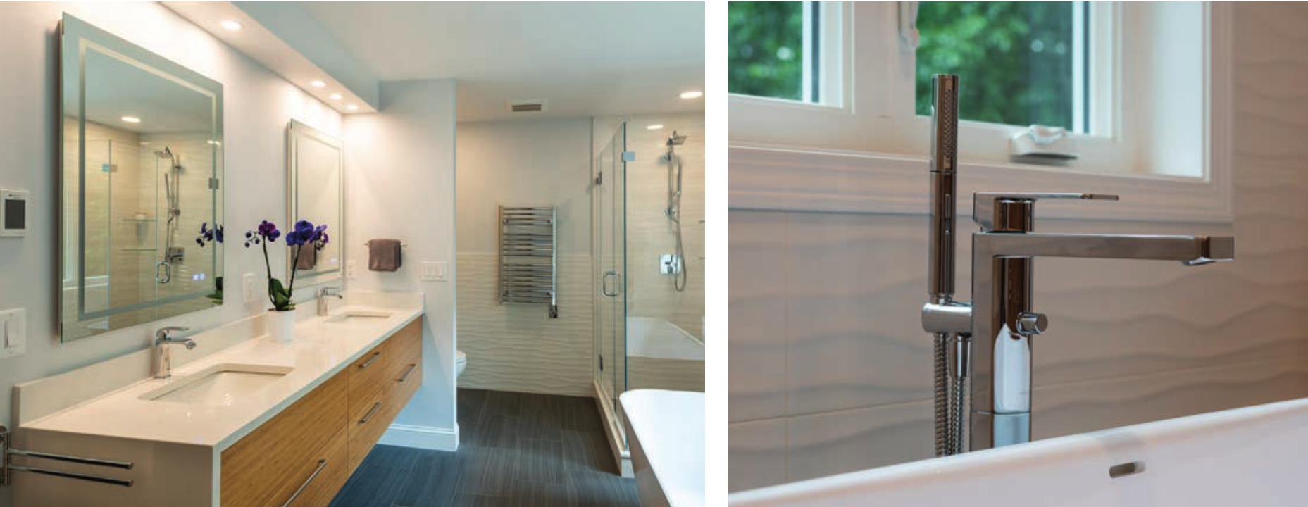 “The style I was looking for was something similar to my time spent in Europe,” Stake says. “I was going for simple and modern. I didn’t want anything too ornate, or feminine or masculine. ” Contractor John Harding, of Image Contracting, turned Stake’s vision into reality by focusing the project on style and practicality. For the bathroom, “Our aim was to bring in the European styles that the homeowners were familiar with through the lighted mirrors, towel warmer and sleek tile design,” Harding says. “We also added extra details like a faux bamboo finish on the cabinetry and heated floor, and added a sense of consistency across the space by carrying the countertop over to the shower with the piece in the corner.”