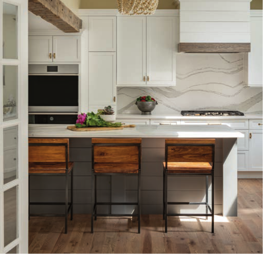 Each detail was carefully considered and placed to make the space more inviting and flow into the rest of the home. “The organic flow of the countertop and backsplash gives movement to the space in contrast with the strong linear lines found elsewhere,” Dillman says. “The touches of wood found in the hood valance, beam, flooring and bar stools add warmth, and the beaded chandelier adds a fun touch to the space and reflects the movement found in the backsplash.”