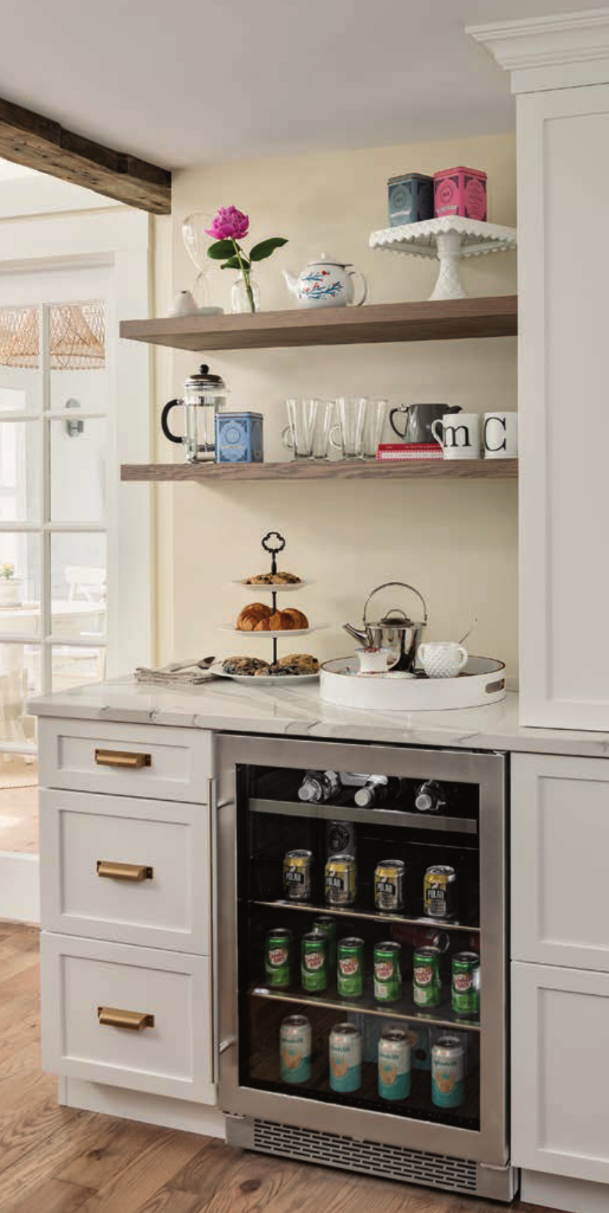 The exposed beam anchors the design, adding character and texture to the space, and a black window was added for an element of drama. Rustic oak floors replaced the floor tile, and were carried into the design of the custom hood and floating shelves. A mix of white and dark-gray cabinets allow the gold-toned hardware to stand out. The team even added a pantry cabinet and tea bar for the owners’ children to use for snack storage and afternoon tea with guests.