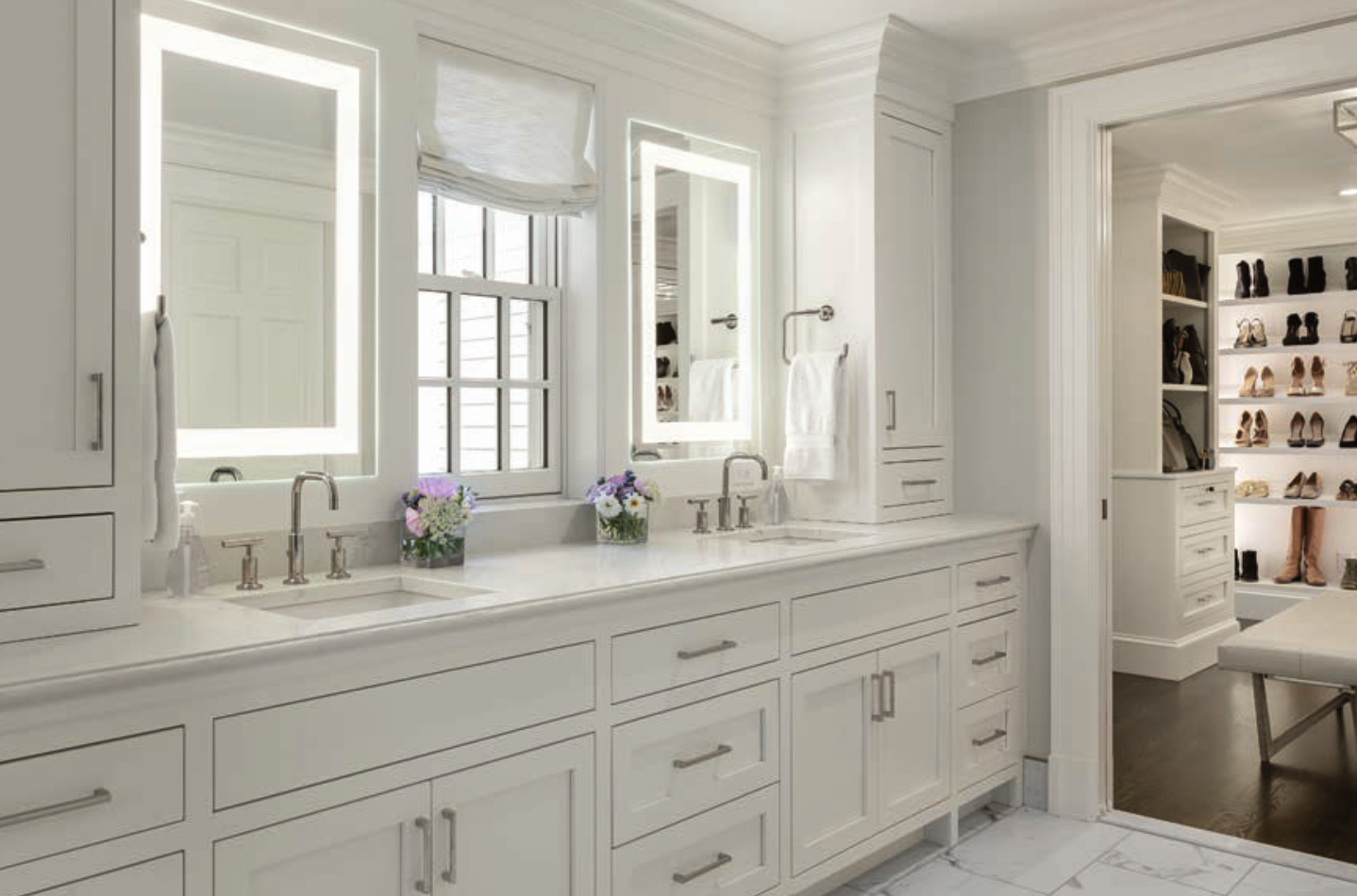 “We added lighting into the shelving units to make sure there wasn’t a lot of glare and hot spots throughout the space,” interior designer Cristina Johnson says. “We aimed for [the lighting] to invoke a sense of softness to help transition from one part of the closet to the next, especially into the bathroom—like with the perimeter-lit LED mirrors.”