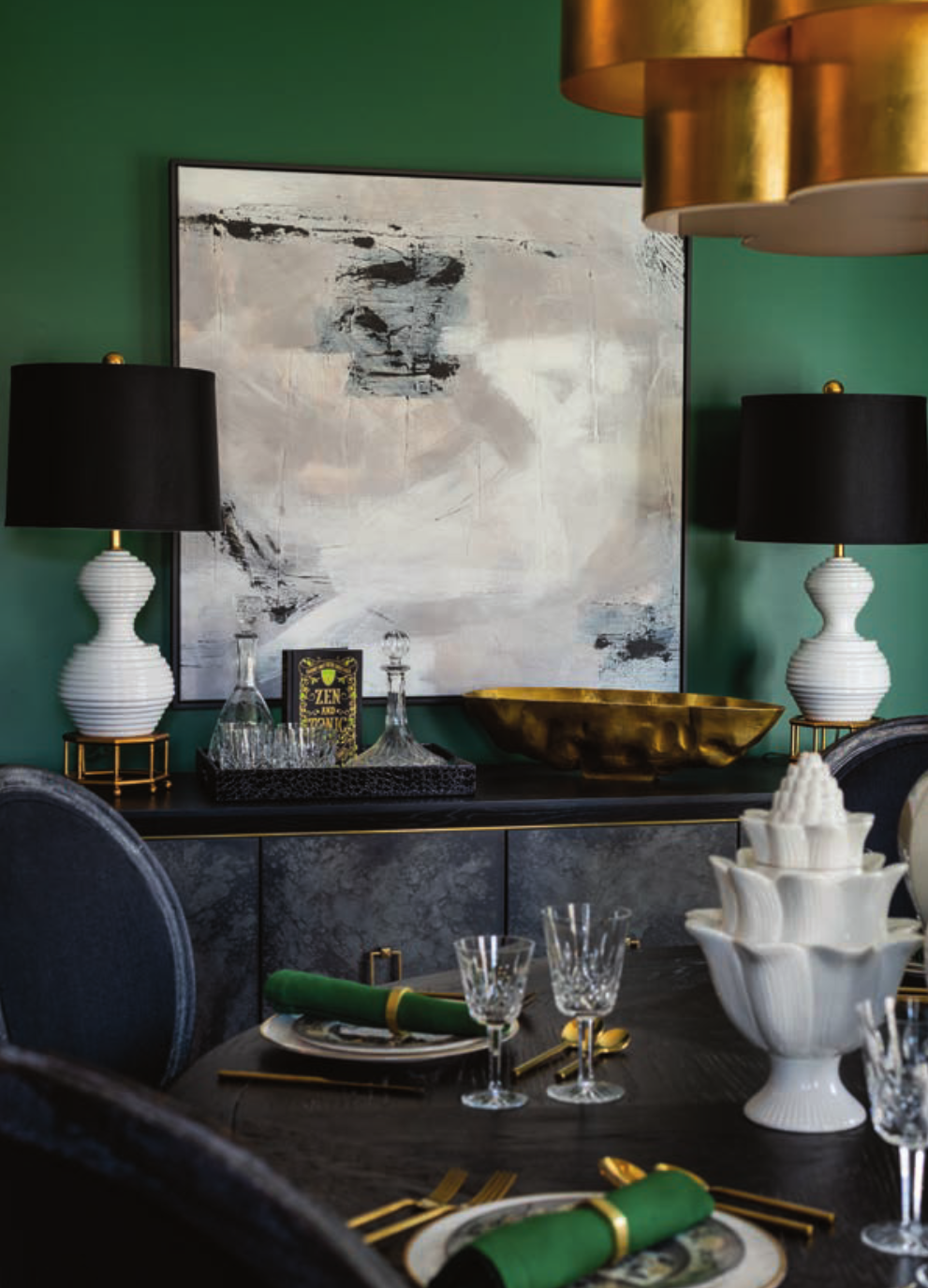 In the dining room, Graham knew she could lean into a little more drama, with the stronger green walls and some graphic design elements. An eye-catching gold light fixture sits in the middle of the room, which is lined with balanced art and dramatic window treatments.