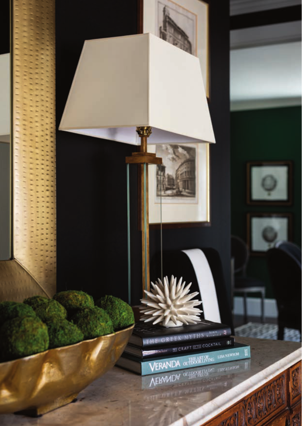 “When I treat a bookcase, I use the one-third space rule,” she says. “One-third space, one-third books, one-third decorative items. It definitely applied there, and I used books with black spines with gold writing, green books, green accessories. It would’ve been a little one-dimensional if I didn’t add a little color.”