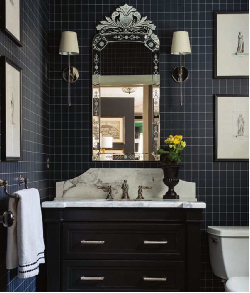 The first step: Create a way for a tall, thin foyer to transition into larger connecting rooms. A welcoming settee made the space more useful, leading to a powder room that Graham describes as “sweet” and among her favorite spots in the house. She chose Ralph Lauren square wallpaper, offset by marble. It’s classic design in nature, but with a touch of fun in the small, round hammered sink.