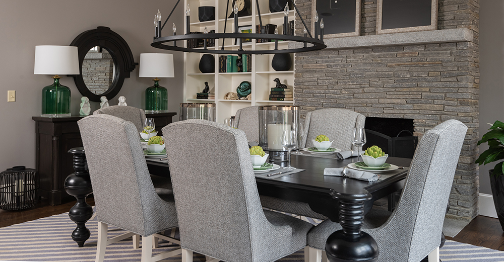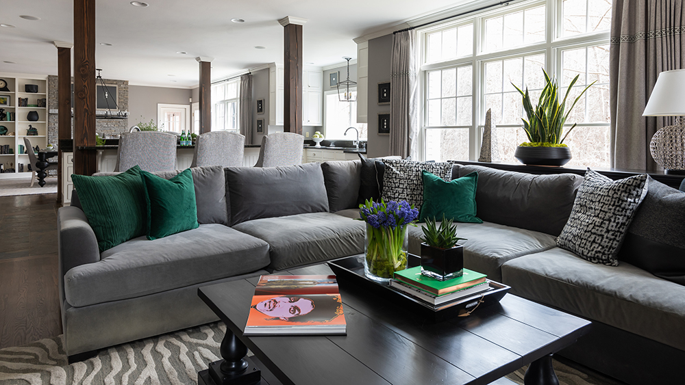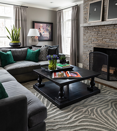 The two fireplaces were a jumping off point for a more neutral color palette—grays and blacks that paired with a vibrant pop of green.