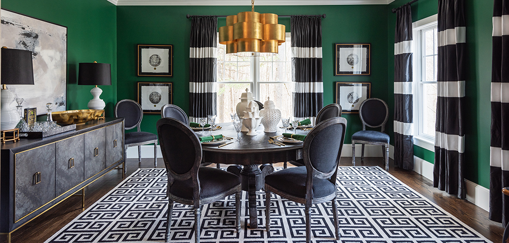 Bold emerald walls add a touch of regality to the formal dining room, while a gilded-gold, modern chandelier draws the eye to the center of the room. Echoing the balance of the historic stamp prints, two lamps frame a strong shagreen buffet table topped with a whiskey decanter resting below a serene modern print that offsets the energetic Greek key rug.