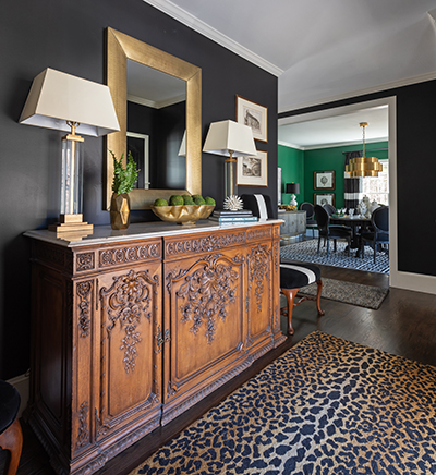 Left: The homeowners’ beautifully carved antique sideboard is the anchor for this dramatic black-walled foyer. Above: A whimsical marine specimen is a favorite accessory of Graham’s that adds a storied element to any surface.