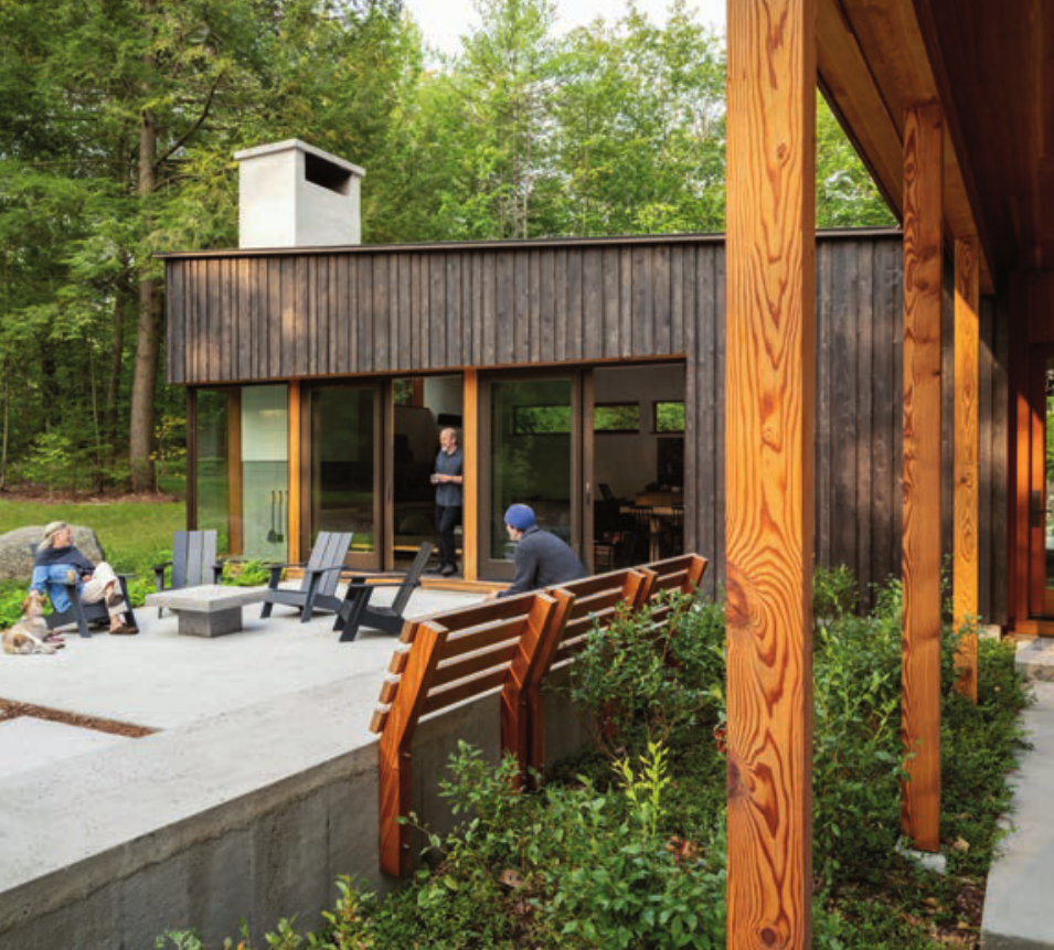 The clients have deep roots in Freedom, a small town situated between the Lakes Region and the White Mountains. They imagined a home that expressed enduring ties to this place while reflecting a breadth of ideas learned abroad. The T-shape plan implies two courtyards— extending the domestic zone of the home into the landscape. Granite boulders, emerging between hardscape, express the splice of the architectural intervention with nature. The entry courtyard is to the north, and the south courtyard gestures toward the fire pit and lake. The living space opens with glass sliding doors and a corner window to the lake. The master bedroom opens to a private patio with an outdoor shower facing the lake. The clients challenged Whitten Architects to think deeply about how a home can be an expression of a particular place and unique people. See more about this spectacular home in the story “Stunning Simplicity” on page 50.