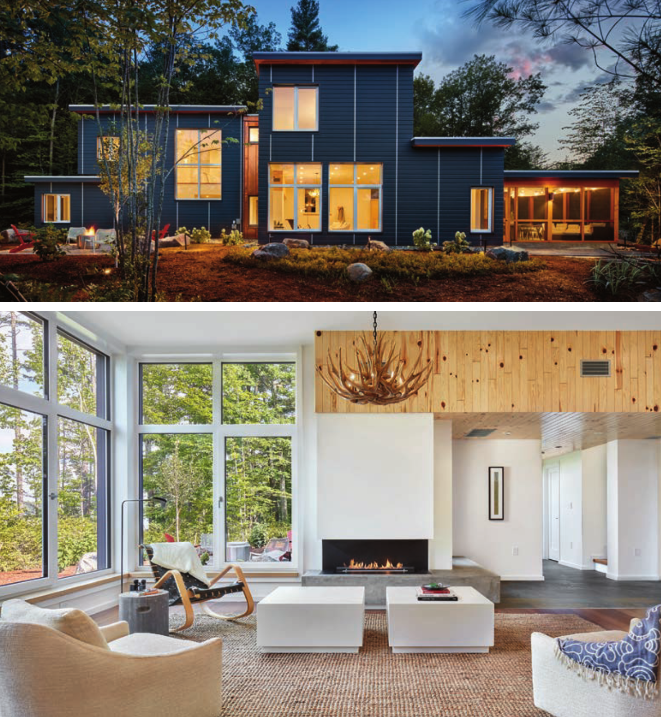 A modern family home achieves exceptional sustainability, and captures views of Lake Winnipesaukee and the New Hampshire woods. The home’s two overlapping volumes are designed to minimize surface area and accommodate the site’s irregular shape, while creating distinct private and public wings. A sliver of the shore is visible through the front door. On entering the compact foyer, the living space expands toward the shore, and the lake view is revealed through tall triple-paned windows. Twelve-inch-thick, super-insulated walls and triple-paned windows minimize energy loss, while strategic window placement maximizes natural light and views. The home uses geothermal heating and cooling, and incorporates sustainable materials. The landscaping incorporates native plants, permeable groundcover and boulders unearthed in the excavation. Tree cutting was minimized to preserve the tree line along the shore and maintain privacy.