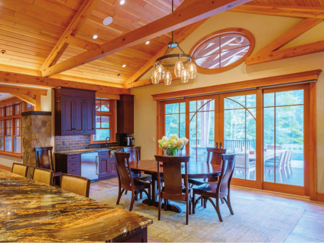A concept resembling a sandcastle addresses many of the client’s objectives: having a tiered form and controlling the exterior visual scale, while also managing the volume of interior spaces. A footpath follows the natural sloping contours of the site, connecting the house to the beach. The home is set back from the shoreline, which provides a better connection with the lake, by optimizing lakefront yard space for entertaining, playing games and enjoying the lakefront. The impressive central living area features a cantilevered timber-framed clerestory and cupola that reaches up to bring sunlight into the space from all available directions. The result is an uplifting quality, while still offering intimate and interesting spaces. The building envelope is airtight and robust in design, providing positive drying opportunity to the interior and exterior. The exterior assemblies are composites of thoughtful layering of natural and recycled materials—which have very low VOCs—with careful attention to detail intended to optimize performance and longevity. NHH