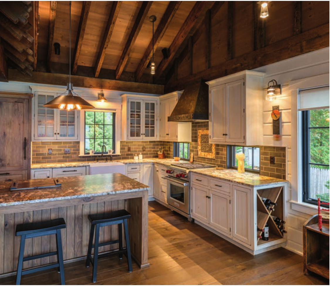The Enchanted Cottage is a historic camp on Newfound Lake that provides the owner with all the modern conveniences of 21st-century living that still maintains the timeless character of a quintessential early-1900s New Hampshire lakefront camp. Despite its entirely new construction, the camp’s design builds on the vernacular of the smaller single-story camp that was original to the site. The second level of the new camp adds a bedroom, bathroom, entertainment nook and window that frames a view of the mountains. Exposed reclaimed rafters and a towering natural-stone fireplace help bring friends and family back to a turn-of-thecentury way of life. At the same time, a modern heating system and super-insulated building envelope are much-appreciated modern conveniences. The landscape consists of native plants and stonework that echo the natural surroundings.