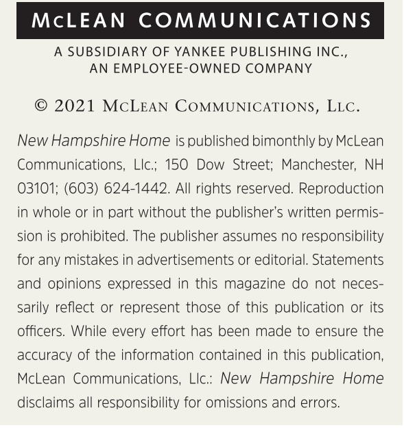 New Hampshire Home is published bimonthly by McLean Communications, Llc.; 150 Dow Street; Manchester, NH 03101; (603) 624-1442. All rights reserved. Reproduction in whole or in part without the publisher’s written permission is prohibited. The publisher assumes no responsibility for any mistakes in advertisements or editorial. Statements and opinions expressed in this magazine do not necessarily reflect or represent those of this publication or its officers. While every effort has been made to ensure the accuracy of the information contained in this publication, McLean Communications, Llc.: New Hampshire Home disclaims all responsibility for omissions and errors.
