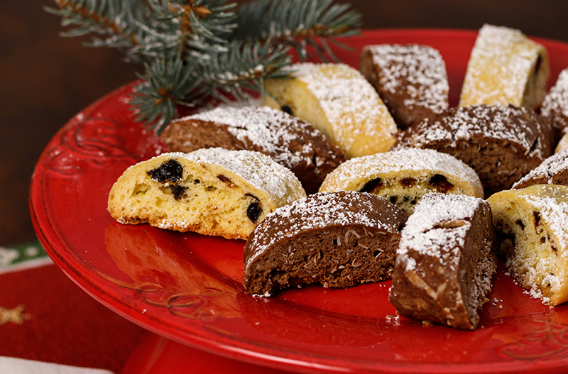 We all have a gazillion things we want to accomplish, and we want to enjoy the holidays without spending hours in the kitchen. For cookie givers and lovers, why not choose cookies that can be made ahead of time, and either frozen or stored? Bar cookies and drop cookies are the easiest and fastest to make, but how about a basic biscotti cookie dough that can deliver four flavors? Now that’s a time saver in my book. Biscotti are durable, dry cookies that often accompany espresso or cappuccino, and they’re great travelers to send to family and friends.