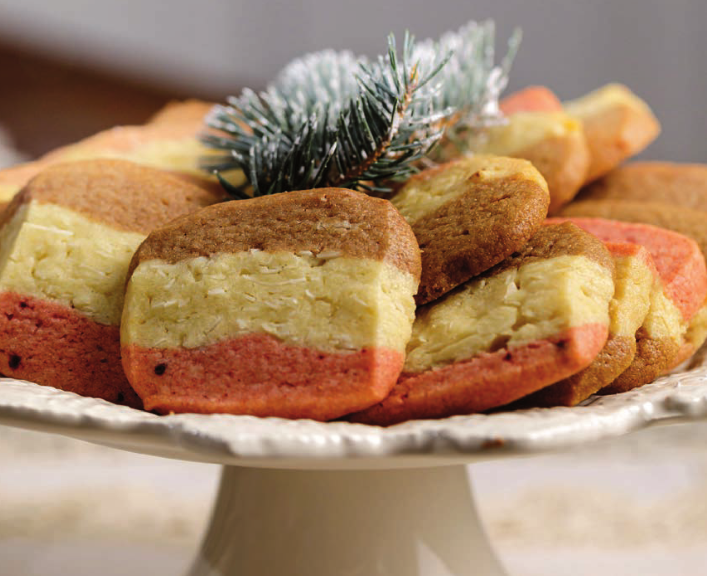 These fun-to-make spumoni cookies were given to me by a friend, and I could not eat just one. These are called “spumoni cookies” after the ice cream of the same name because of their pink, white and brown colors. Before baking, the dough is frozen and then cut into slices. Instead of food coloring, natural beet powder was substituted, and is available online or in health-food stores.