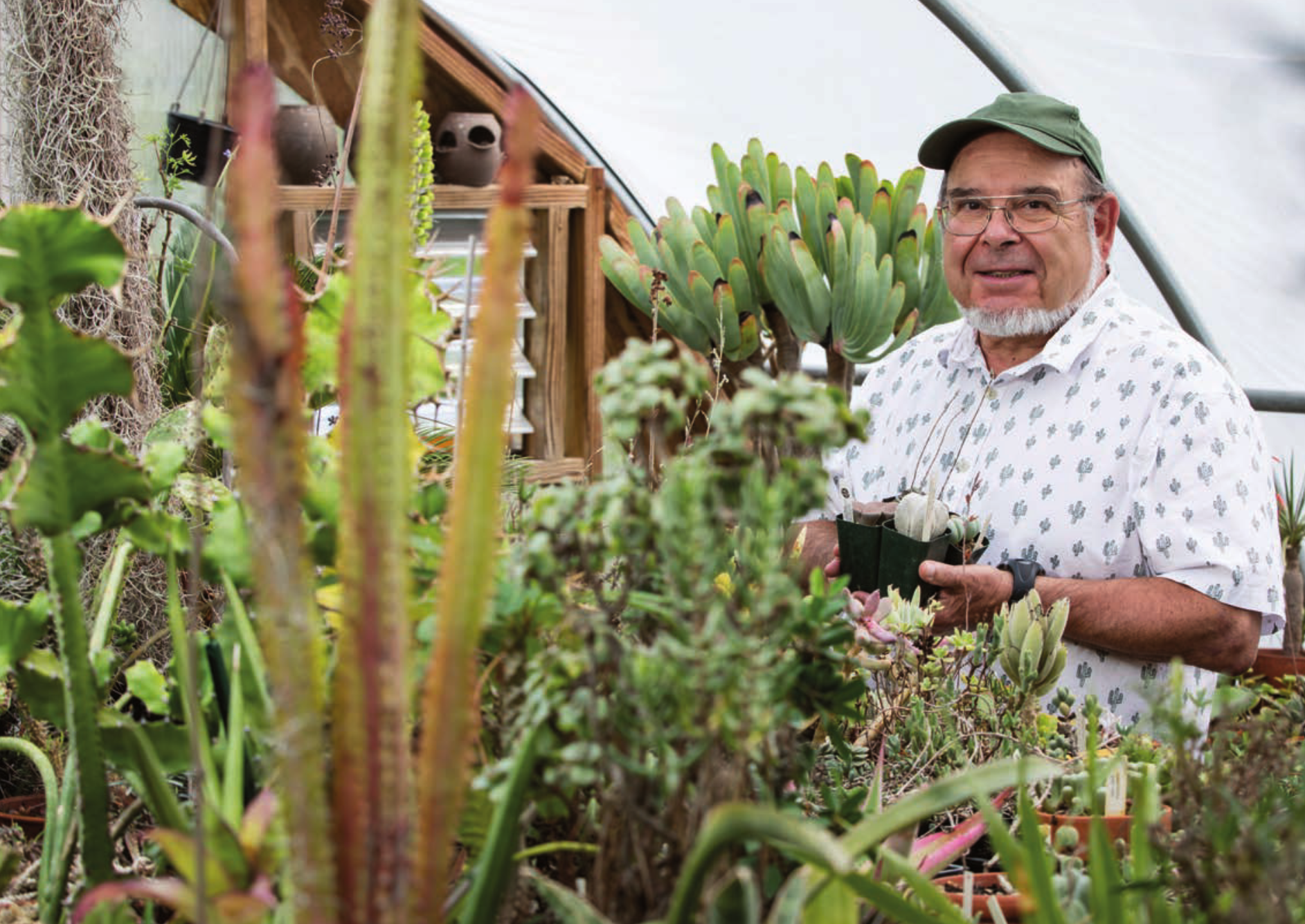Top right: Art Scarpa—in one of his signature cactus-patterned shirts—has been collecting succulents and cacti for over 60 years. He is holding a rare Tephrocactus geometricus from South America. This page: At right, with the spiral growth, is another rare South American succulent, Eulychnia spiralis. The flowering plant behind it is an air plant (Tillandsia sp.) On the far left is Medusa’s Head (Euphorbia flanaganii). which will grow yellow flowers in the summer.