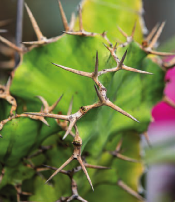 Top, left to right: Haworthia reinwardtii, Haworthia truncata (horse’s teeth) and a Gasteria (the bowtie plant) Above: Euphorbia grandicornus from South Africa, where it grows to be a large shrub.