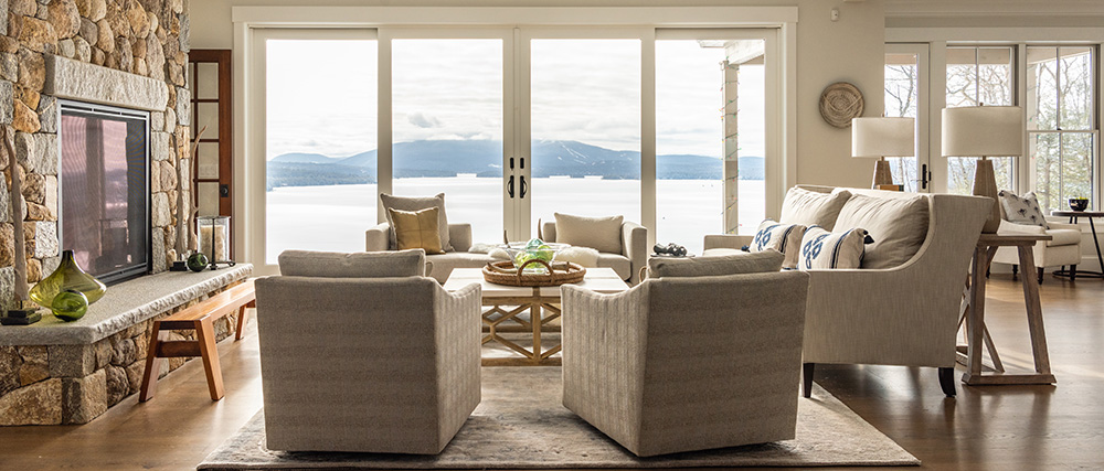 One of her trademarks is to keep the décor from competing with the natural beauty of New Hampshire’s lakes, mountains and woods designed by Mother Nature. This was a key forethought in the interior planning of another Lake Sunapee project, this one with the professionals at Old Hampshire Designs of New London.
