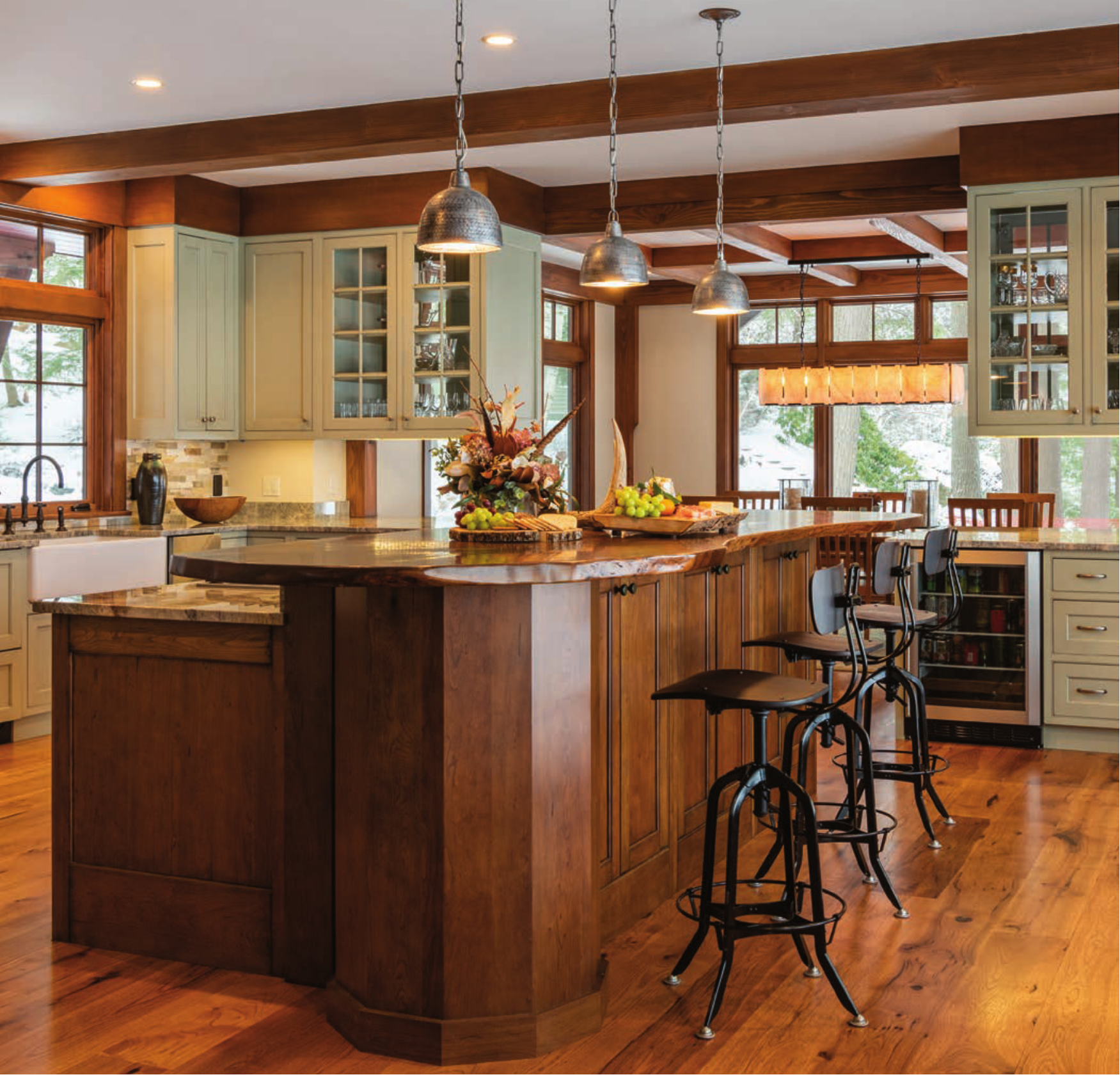 Above: A dramatic run of walnut countertop serves as the perfect bar surface for gathering in the kitchen. Soft sage green contrasts with and complements the wood island, and glass uppers allow for an unobstructed view into the adjacent dining room.