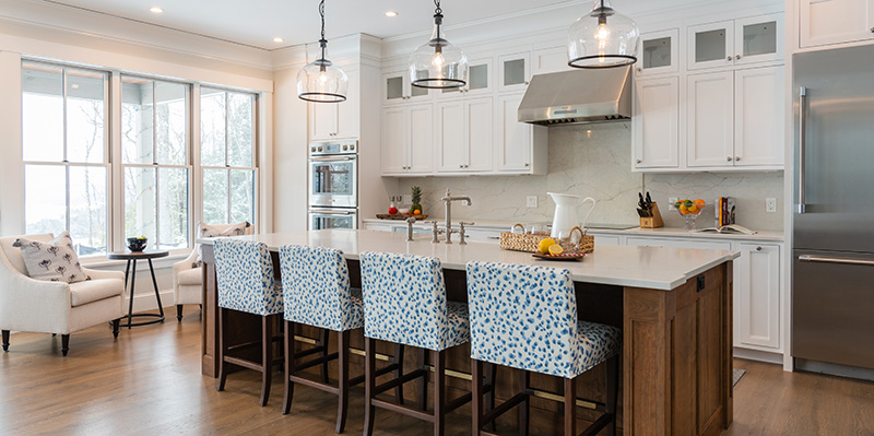 Left: A large wooden table grounds the space and offsets the stark white cabinets. The continuity of the full-stone backsplash gives a hint of warmth, while the stools upholstered in blue animal print add a pop of fun in the eat-in kitchen.