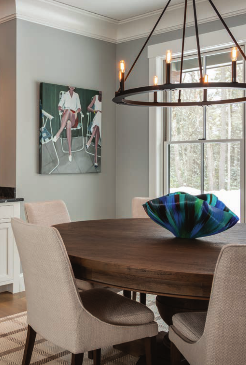Among her recent projects, which take eight to 12 months from inception to completion, are a spectacular 7,000-square-foot newly constructed house on Lake Sunapee. Studio Sage teamed with the award-winning Bonin Architects of New London and Meredith. “We partnered with Bonin to pick the beam color, the trim profile, the floor materials, all the title, the plumbing fixtures—everything right through the window treatments. One of the things that’s really great about my technical experience is that I can help anticipate the next decision that has to be made, so I can stay ahead of the contractor’s schedule. We work through that process with the design/build team, and in the end, we arrive at the finishing process. It is not a sprint. It’s a marathon.”