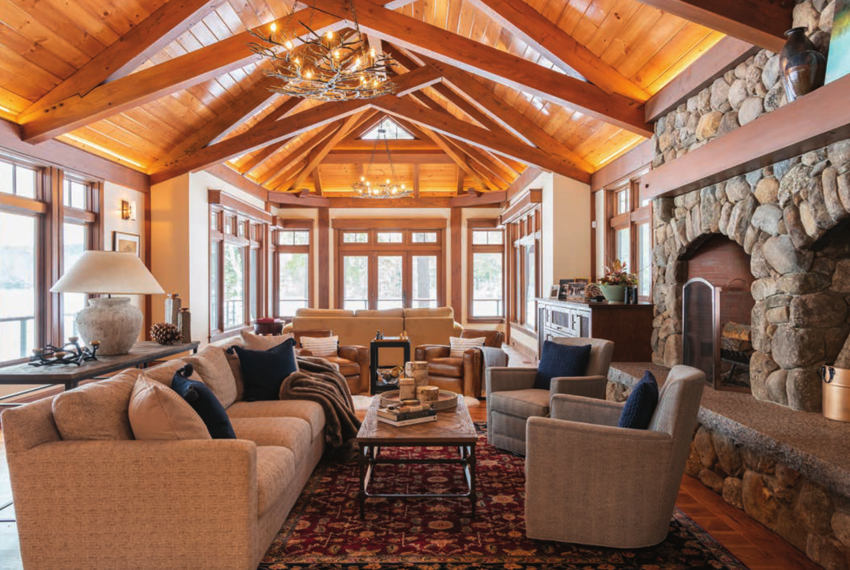 One of her trademarks is to keep the décor from competing with the natural beauty of New Hampshire’s lakes, mountains and woods designed by Mother Nature. This was a key forethought in the interior planning of another Lake Sunapee project, this one with the professionals at Old Hampshire Designs of New London.