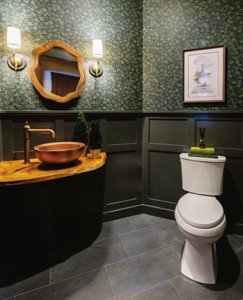Above: Powder rooms, says Raymond, are places where she can “push the design envelope.” While the charcoal painted wainscotting and moody wallpaper might be too risky for a high-traffic, public area, here they create a dramatic surprise.