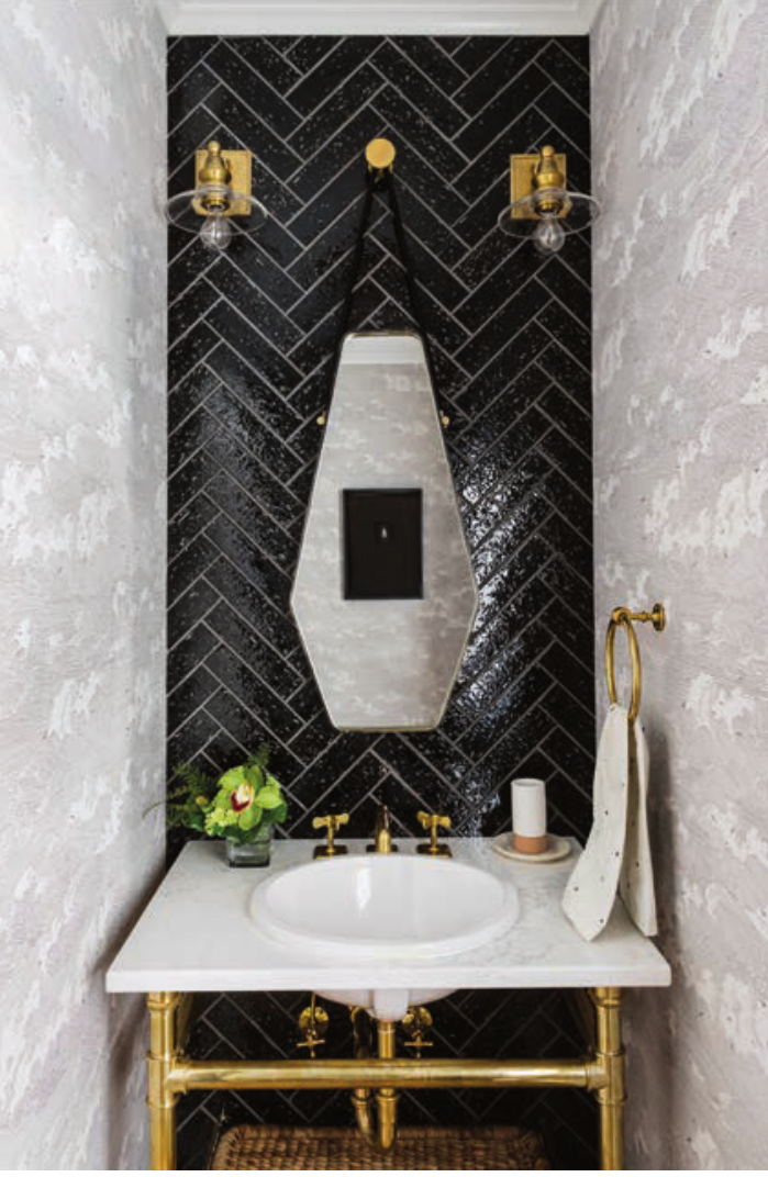 Right: Gold and black continue into the bathroom, which features a dramatic tile wall.