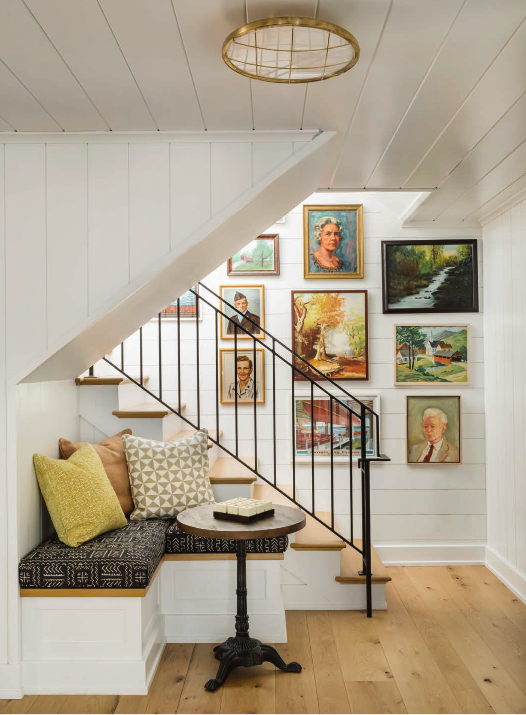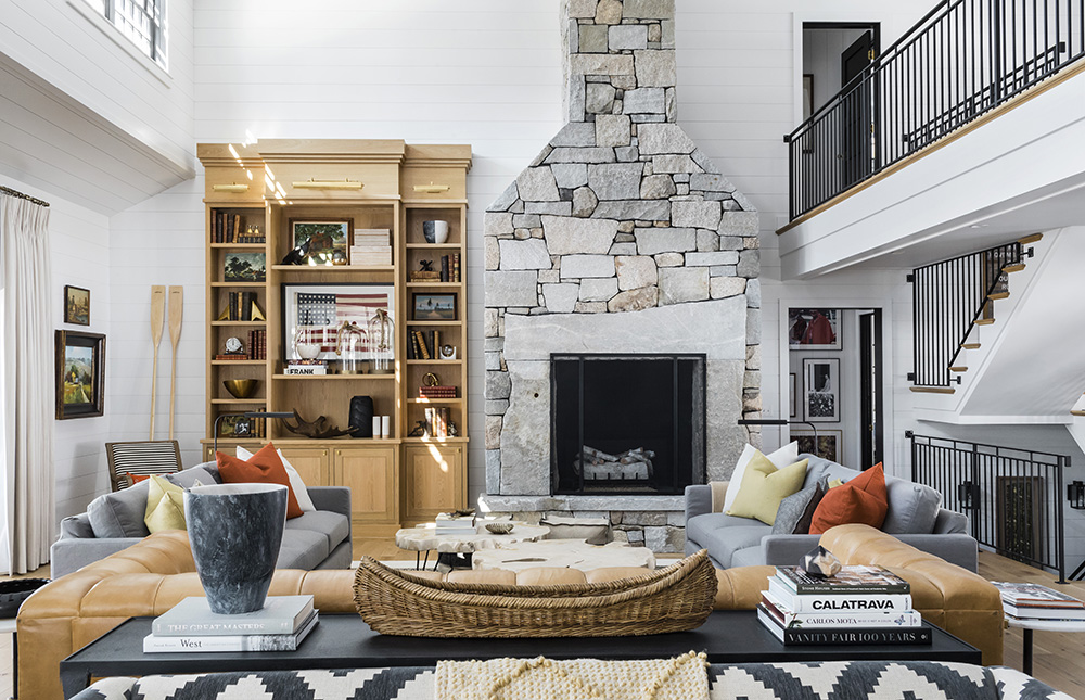 Jackson’s grandfather first visited Lake Winnipesaukee in the summer of 1937, and now, 85 years later, her children are the fifth generation to swim, play and grow up in the same waters. Finding inspiration in the surrounding environment, she wanted to use natural materials, texture and pops of color to give the home a comfortable, laid-back and interesting design that didn’t feel too formal. “I went into this project knowing that it is a vacation home, not my full-time residence, so I could take risks and play, and really incorporate my personality into the home,” Jackson says. “I wanted the house to have a ‘writer’s cabin’ vibe with layers of history everywhere, taking inspiration from eras of design from the ’40s to the ’70s. I imagined incorporating those styles throughout the house in furniture pieces, fabrics, art and more, so every space would be comfortable and convenient for all age ranges coming through our doors.”