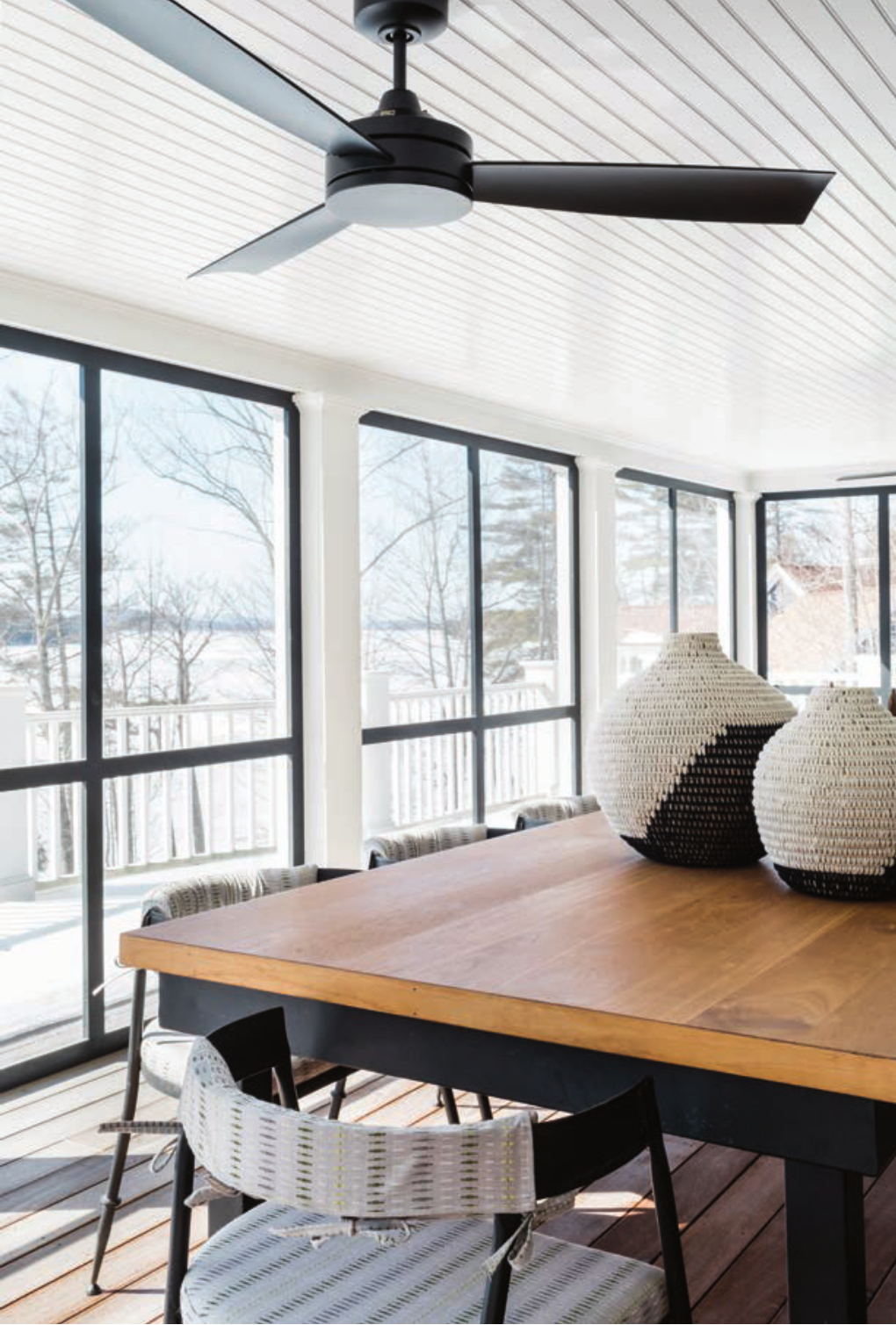 Through the front door, visitors are welcomed by a natural entryway with warm, wood tones and a rug for an energized, yet cozy look. As you walk into the living room, it’s hard to miss the two-story granite fireplace. There are also a textured rug and bold, black windows that look out over the lake. The porch includes its own dining area with expansive, pocketed sliding doors that extend the living room into a protected, open-air space that seamlessly connects the indoors to the outdoors. “Spaces like the living room and porch have large windows and sliders to create a comfortable transition and axis from the front to the back of the house,” Beland says. “This is the first impression upon entering the home as well as the starting point to then branch off and relax in the variety of other spaces.”