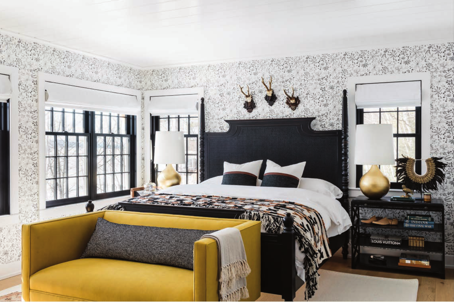 Above: This bedroom reflects Jackson’s “writer’s cabin” inspiration, and design elements from various eras—the ’40s, ’60s and ’70s—can be found in the delicate details and bold use of color.