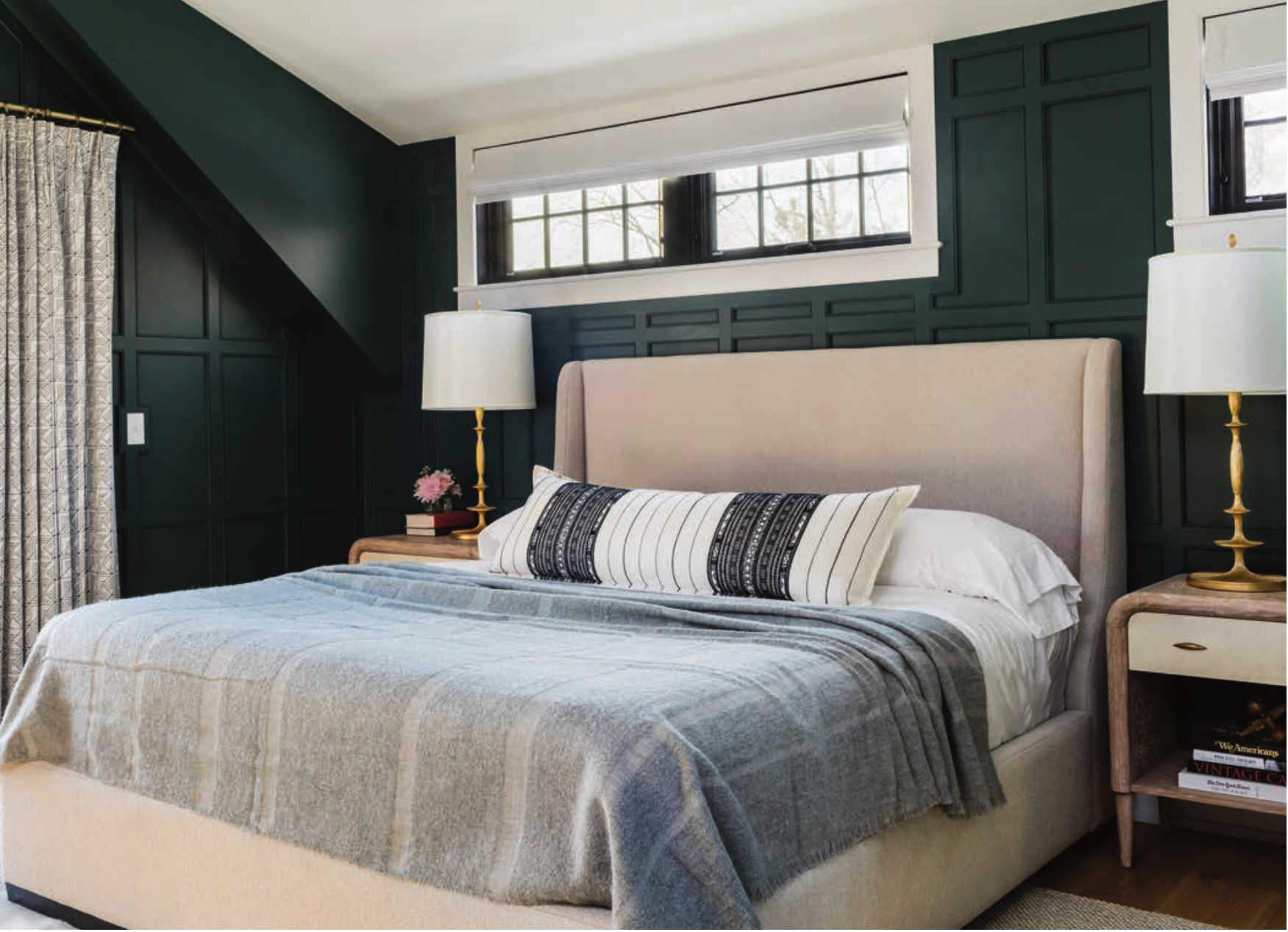 Above and left: The master bedroom displays a distinct, strong softness in its deep green walls and balance of texture in lamp fixtures, blankets and décor.