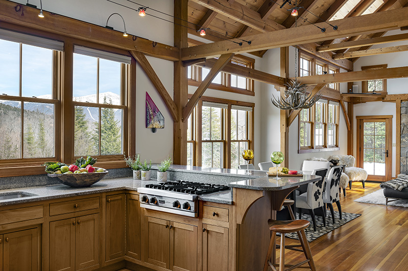 One floor up, on the home’s main level, spectacular views of Mount Washington and the White Mountain National Forest are visible through windows that cover the length of the house—from the primary bedroom through a three-season room, kitchen, dining room and living room. Natural light pours into the house, and cherry wood throughout imparts warmth.