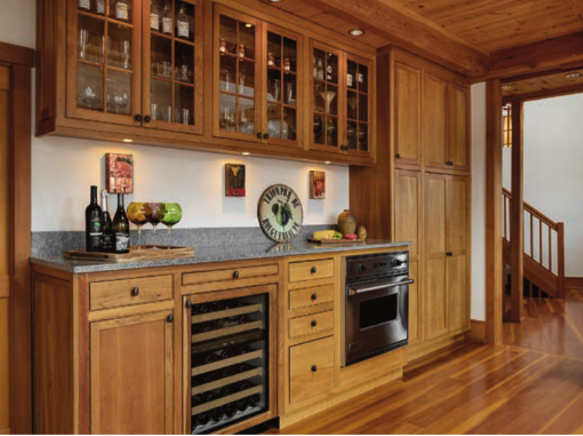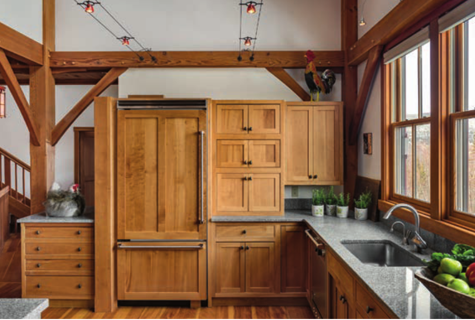 Across from the dining area is a full bathroom and a TV room, although the TV is rarely turned on, Buddy says. Also bordering the dining area is the kitchen. A well-designed, spacious kitchen was important to the Phaneufs. With limited dining options nearby and a son-in-law who is a former chef, “We spend the weekends cooking,” Buddy says. Not to mention, “After you’ve been skiing all day, you don’t feel like getting dressed and going out somewhere,” he says. “So, we wanted to have a big, open kitchen where people could gather around.”