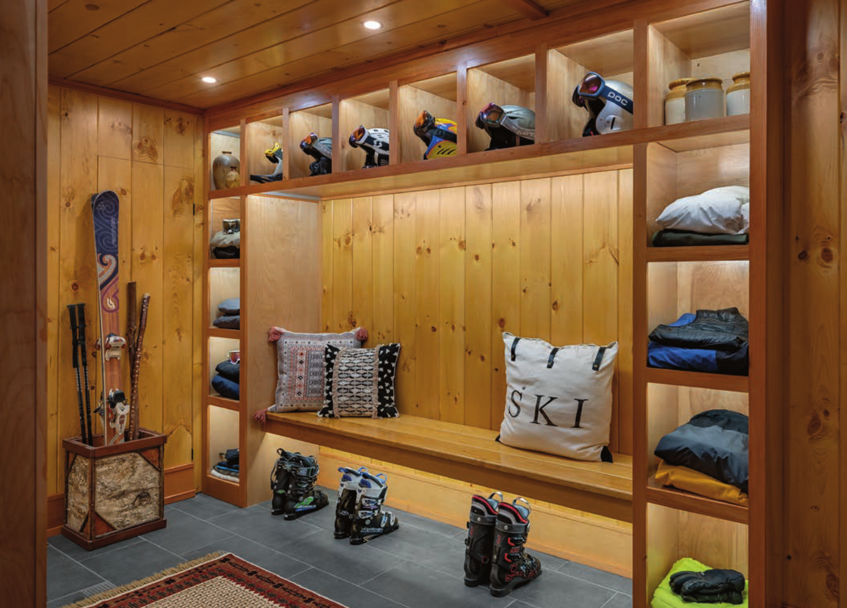 Plenty of seating is available with two long, built-in benches on opposite sides of the ski room, enabling a small crowd to be together as they suit up in the morning or take off layers at the end of the day. Storing bulky coats isn’t a problem, and individually lighted cubbies provide space for each person’s gloves and other accessories.