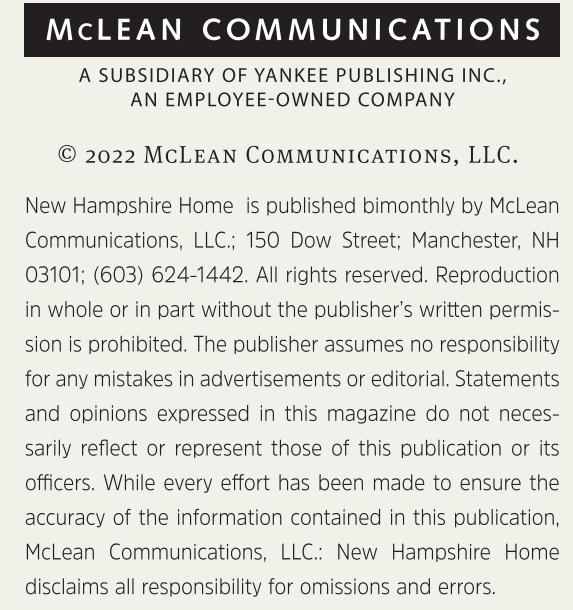 New Hampshire Home is published bimonthly by McLean Communications, LLC.; 150 Dow Street; Manchester, NH 03101; (603) 624-1442. All rights reserved. Reproduction in whole or in part without the publisher’s written permission is prohibited. The publisher assumes no responsibility for any mistakes in advertisements or editorial. Statements and opinions expressed in this magazine do not necessarily reflect or represent those of this publication or its officers. While every effort has been made to ensure the accuracy of the information contained in this publication, McLean Communications, LLC.: New Hampshire Home disclaims all responsibility for omissions and errors.