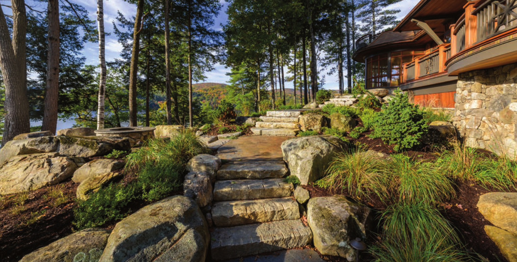 Big Grey Rock is aptly named for the abundance of exposed granite ledge dominating the natural landscape. Environmental sensitivity, enhancement of the natural elements, and use of native and natural materials were emphasized in designing the site landscape. Guests arrive in a stately entry court paved with reclaimed granite slabs. The courtyard establishes a sense of scale, maturity, and endurance before you even step foot in this exquisitely crafted residence, which includes a man-made, yet naturalistic waterfall, artfully crafted fieldstone walls and reclaimed granite steps, a variety of outdoor spaces that extend living spaces beyond the walls of the home, mixed garden beds, patios and more.