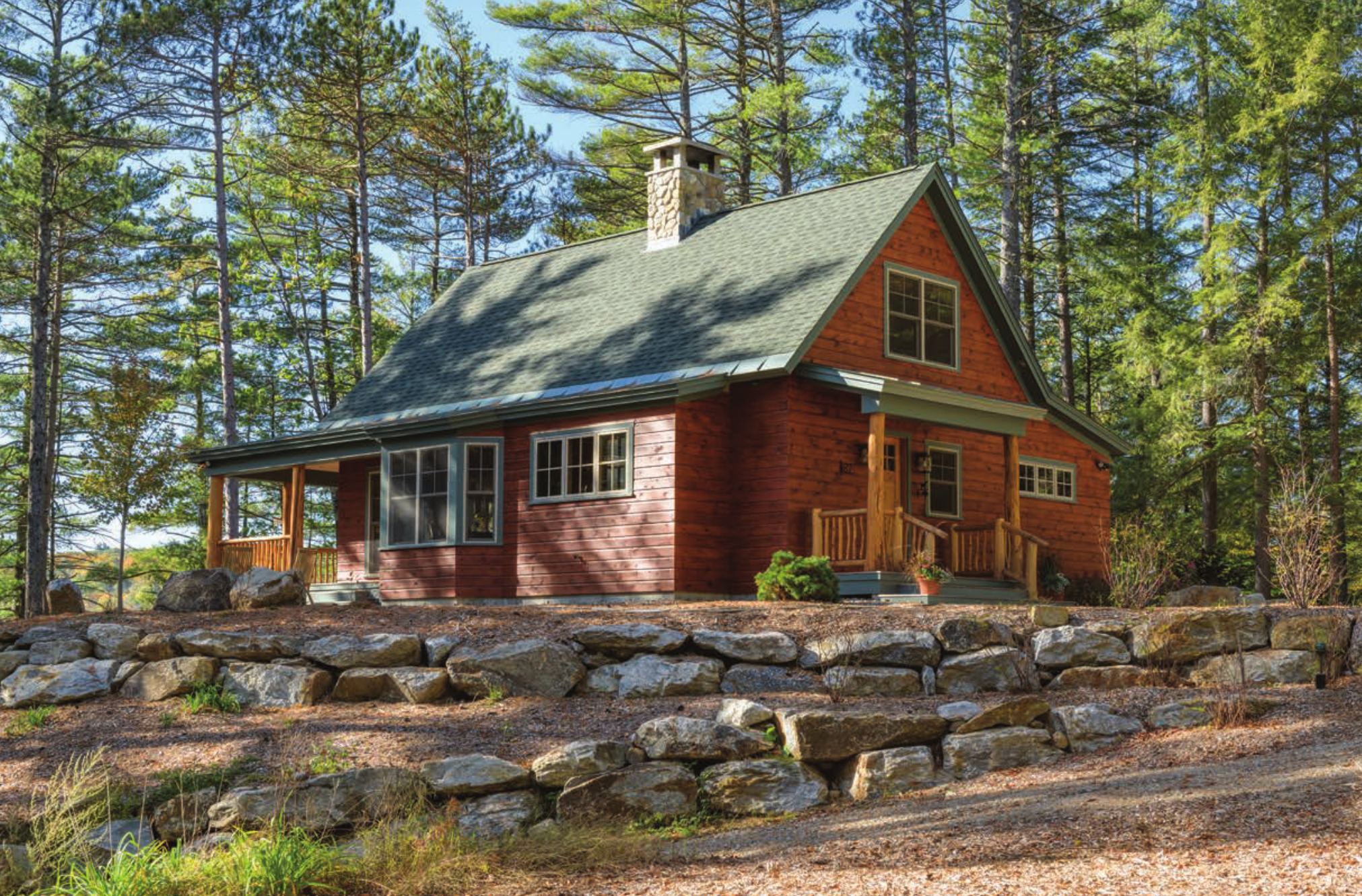 Old Hampshire Designs, Inc. has been designing and building homes since 1984. This quintessential lakeside cabin was designed to use timber harvested directly from the property on Blaisdell Lake. It features a welcoming open floor plan and loft, spacious covered porch overlooking the lake and a fully equipped wet bar complete with retro-designed appliances. Fourteen thousand board feet of lumber was harvested and milled from the property and includes white pine for the exterior siding and trim, interior walls and ceilings as well as red oak flooring and interior decorative trim and baseboards. Oak trees from the property were also used for porch posts, interior support and decoration and stair railings. The keystone from the original 1901 fireplace was saved and replaced in the new artfully crafted design. This efficient cabin is a classic testament to preserving New Hampshire’s unique Lakes Region history, conservation and living comfortably in a small footprint.