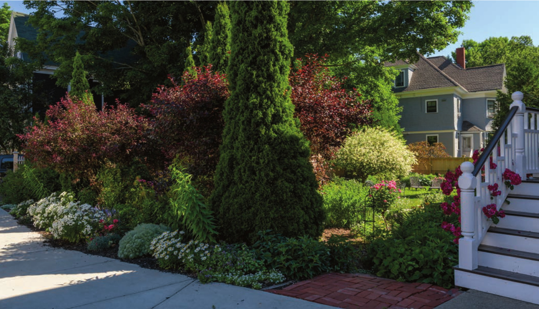 Their gardens are broken into vignettes with the areas defined by shrubs as well as hedges of roses and boxwood. A profuse bed of flowers flows along the street and is backed by a tall, mixed hedge that still allows views into the gardens.