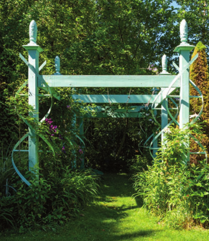 “I’m very fond of vines and things that trail,” says Barbara, who also has several wooden trellises covered with clematis and grows annual vines, including passiflora ‘Kew Gardens’ and hyacinth bean.