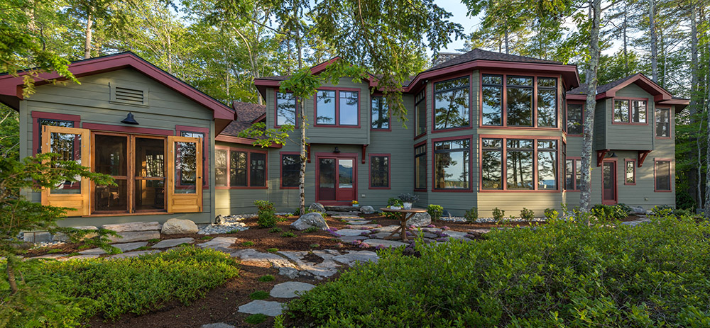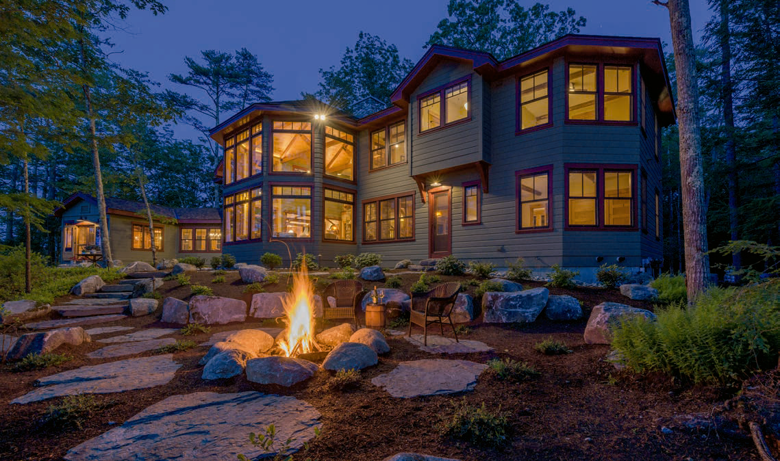 Members of Stephens Landscaping Professionals in Moultonborough installed stone pathways and three patio spaces, including a coffee patio and a grilling patio. A fire pit provides a haven for evening s’mores or for just watching the loons. A small beach leads to crystal clear water.