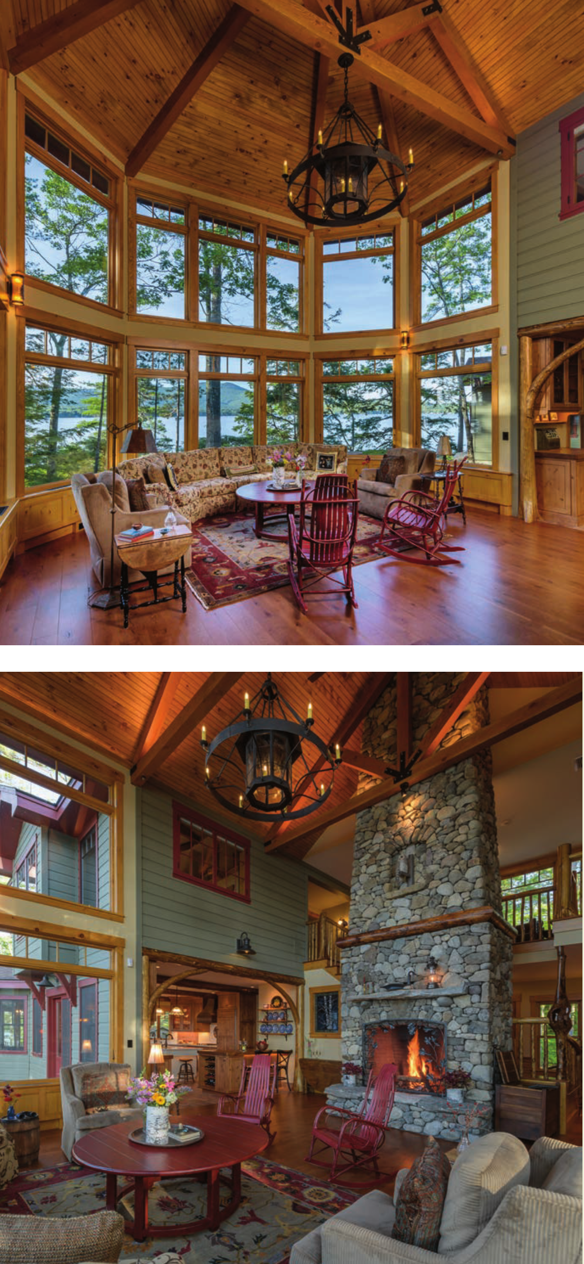 The two-story great room includes a beadboard cathedral ceiling, and picture windows from the original (property) that stretch “from near the floor all the way up to the roof.”