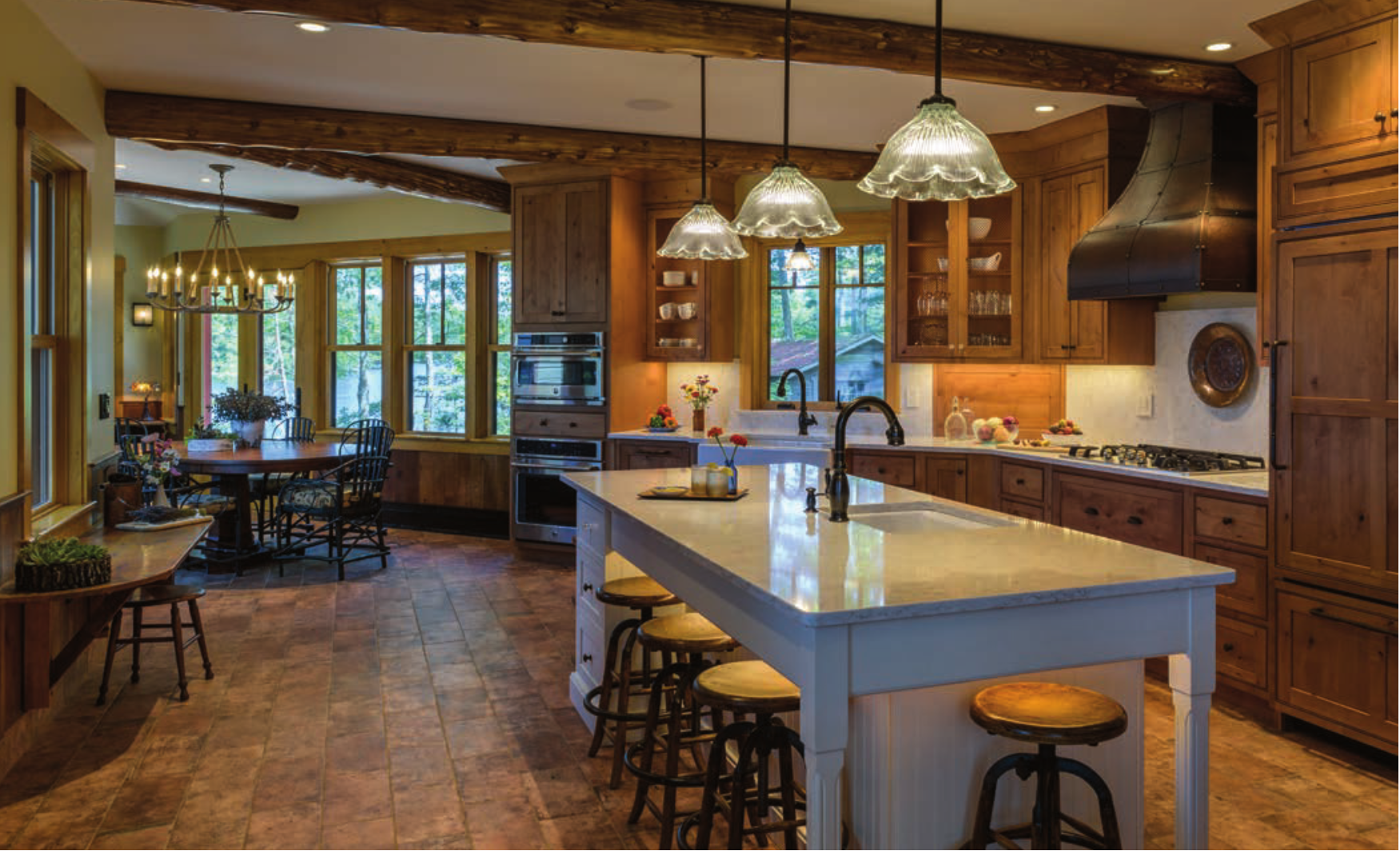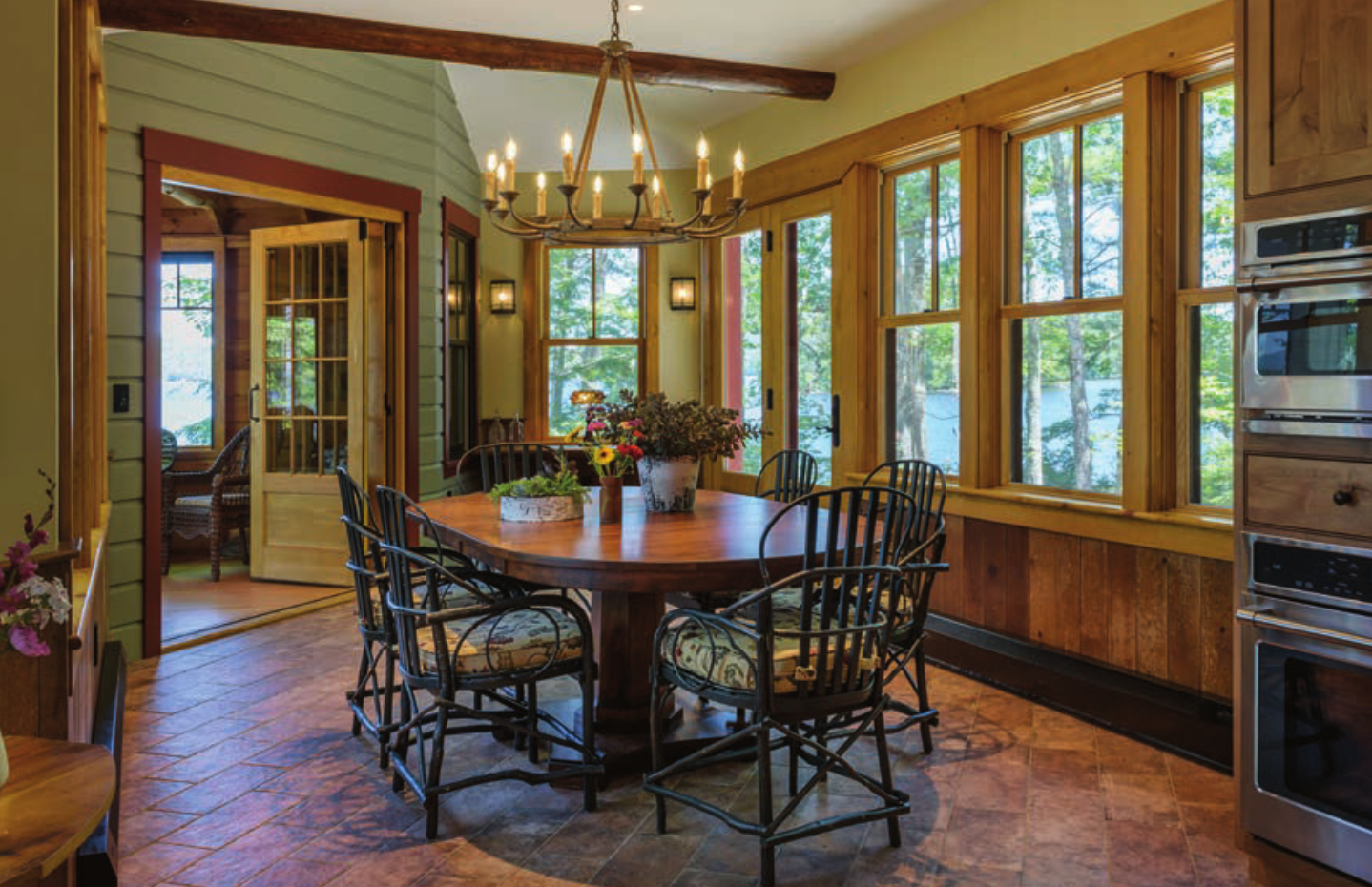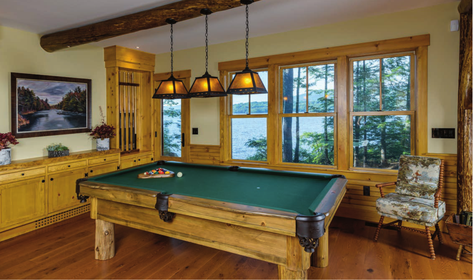 Inside the great room, picture-perfect views of the water can be seen through large expansive windows. The home’s timeless style blends in subtle nods to the old hunting and fishing cabins of the 1930s and ’40s.