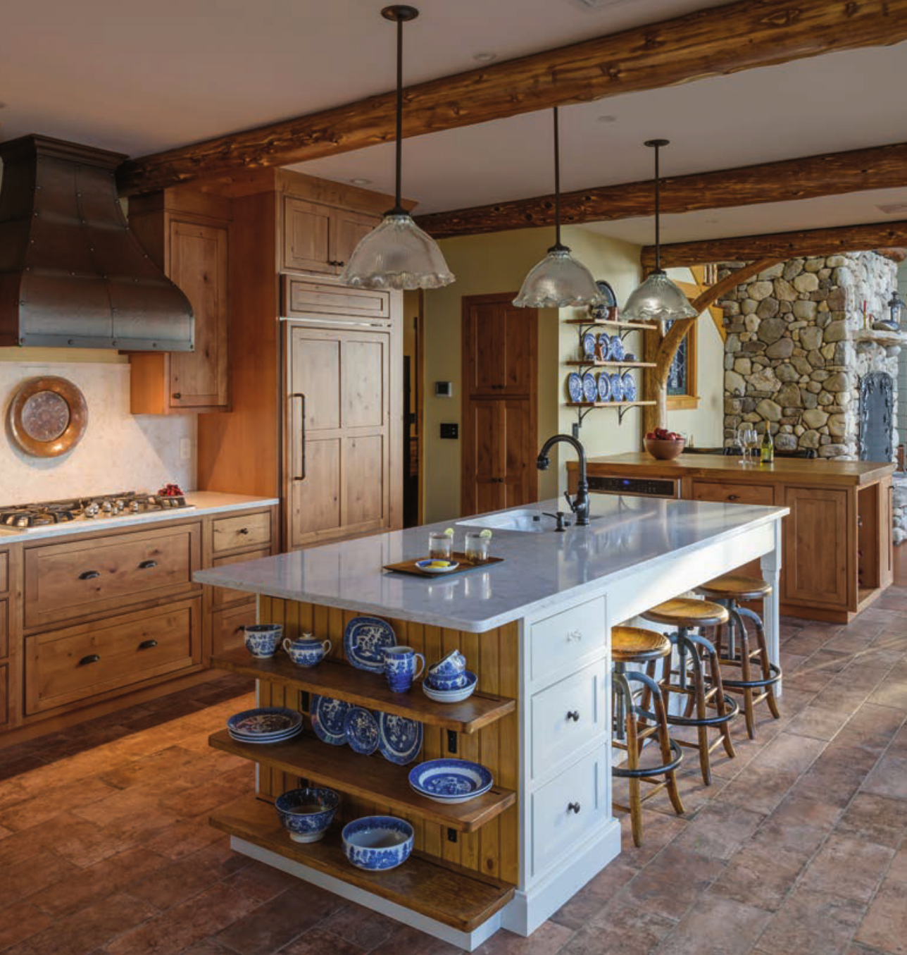 Ana says Natt and Caleb King of King Stoneworks in Moultonborough went above and beyond to custom-create the two-story stone fireplace. Its veneer stones hail from the Poconos, while the mantle stone and hearth stones were sourced locally here and in Maine.
